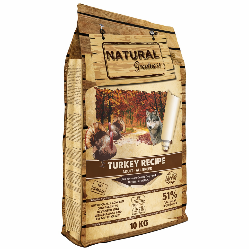 Give your dog the nutrition they naturally deserve with Natural Greatness Turkey Recipe, a premium, complete and balanced dry food specially formulated for adult dogs of all breeds and sizes.